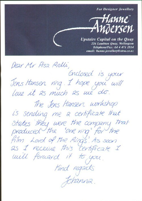 Faithful reproduction by Jens Hansen Studios (“JHS”), the jewelers in New Zealand who created the One Ring and other jewelry for the motion picture production. I have the distinction of being the first person to acquire this replica from JHS, which followed my correspondence with them about their involvement in the production. In addition to kindly indulging my curiosity, JHS offered to sell me their stock ring that was the basis of one of the versions used in the production. Soon thereafter, JHS began selling the One Ring replica, along with the chain on which Frodo carries the ring throughout the movies, on their website, with a certificate of authenticity and custom display box.